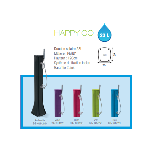 La douche solaire Happy Go combine petite taille et grande capacité, son utilisation est facile et amusante.